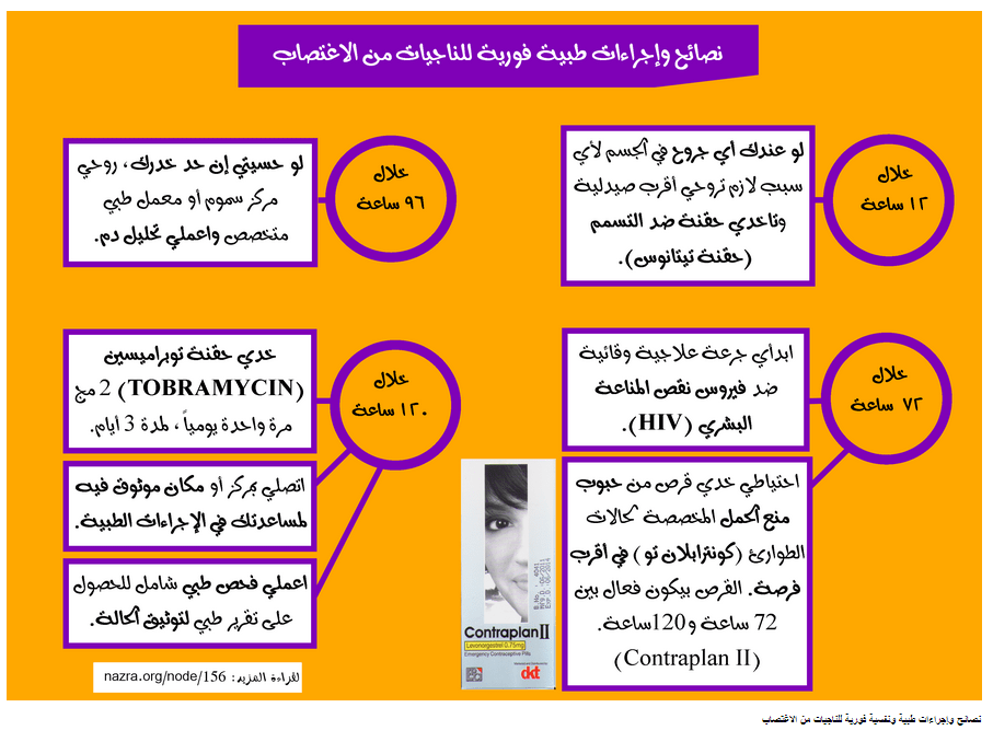 * ينصح بشكل عام بإتباع الإجراءات الطبية في أسرع وقت ممكن بعد وقوع الاغتصاب.